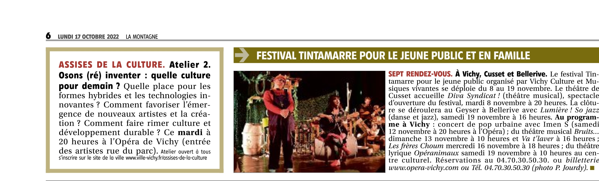 AccueilRevue de presseRevue de presseRetrouvez tous les articles de presse relatifs aux actions de Musiques Vivantes. Festival Musiques Vivantes 2023Haendel au Festival Musiques Vivantes, baroque au pays des barriques—Ôlyrix—En savoir plusMusiques Vivantes : Florent Héau à l’opéra, enchanteur sans chanteur—Classykeo—En savoir plusAu Festival Musiques Vivantes, l’insolite tient la corde—Ôlyrix—En savoir plus Des trésors de musique et de patrimoine—La montagne—En savoir plusFestival Musiques Vivantes 2022Loco Cello, l’art de jouer avec un violoncelle—La Montagne—En savoir plusLes Variations Goldberg, à écouter samedi—La Montagne—En savoir plusLes grandes voix de l’Opéra clôturent Musiques Vivantes—La Montagne—En savoir plusLe festival Musiques Vivantes programme un concert en soutien aux Ukrainiens à Vichy—La Montagne—En savoir plusPour vivre un été festif avec les artistes —La Montagne —En savoir plusDes tentations musicales et estivales—La Montagne—En savoir plusLes festivals de l'été —La Montagne —En savoir plusÉmission du 16/09/2022 —RCF—En savoir plusLes Musiques plus que jamais vivantes—La Montagne—En savoir plusFestival Tintamarre 2022Un embarquement musical en 7 escales —La Montagne —En savoir plusLes élèves s'apprêtent pour Tintamarre —La Montagne —En savoir plusFocus sur la pop urbaine—La Montagne—En savoir plusFestival Tintamarre pour le jeune public et en famille —La Montagne—En savoir plusLes élèves répètent pour Tintamarre —La Montagne—En savoir plusQue le spectacle vivant resplendisse —La Montagne—En savoir plusLumière So jazz ou Geyser —La Montagne —En savoir plusLa vie et ses petits riens qui bruitent !—La Montagne —En savoir plusUn chœur de 1 000 fans pour Imen Es—La Montagne —En savoir plusÉvasions sonores —Reflets d'Allier —En savoir plusDu son pour petits et grands —Octopus Magazine—En savoir plusActions culturellesMusiques Vivantes, une expérience sensorielle à destination du jeune public—La Montagne—En savoir plusLes marmots sur la scène de l'Opéra de Vichy—La Montagne—En savoir plusL'épanouissement scolaire et musical en classe ULIS—La Montagne —En savoir plusLes écoliers prêts pour Tintamarre—La Montagne —En savoir plusDes ateliers entre chants et percussions—La Montagne—En savoir plusLa nature et la forêt mises en musique—La Montagne—En savoir plusConcerts en milieu hospitalier social —La Montagne—En savoir plus